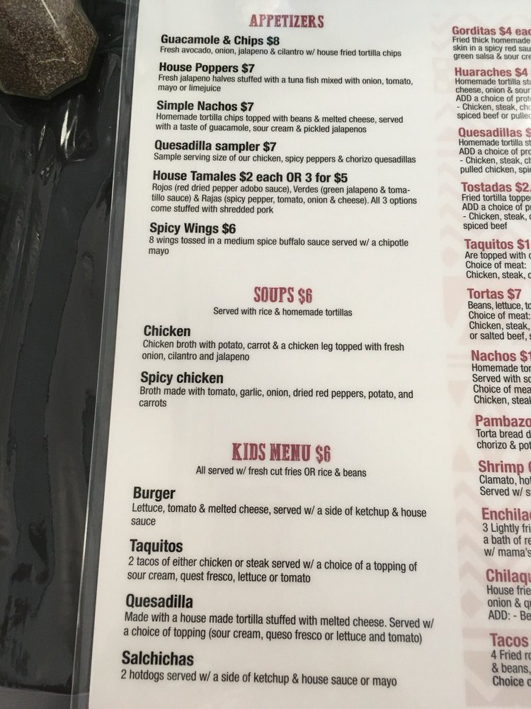 Beans, lettuce, tomato, onions, pickled jalapenos, avocado and white cheese. Choice of meat.